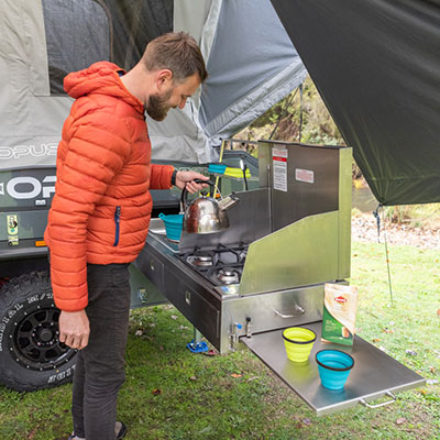 This incredible range of camper trailer slide-out kitchen features makes the OP2 air trailer incredibly versatile and functional when catering for extended families and friends.